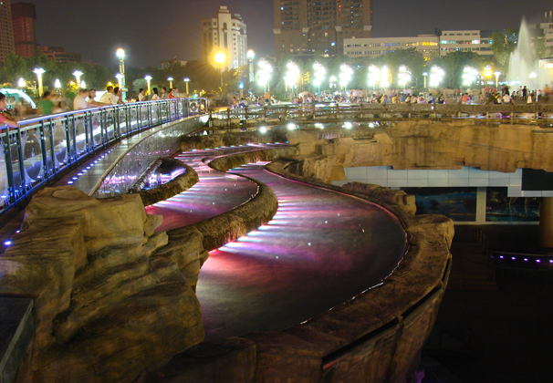 對廣場、景觀的夜景照明應是藝術、文化、功能和裝飾性并重。在滿足集會、演出、休憩的功能照明需要時,設計中應考慮除廣場文化性外,還要在照度和均勻度上達到相應標準,并嚴格控制眩光程度,多采用間接照明的方式即通過光的反射原理形成二次光源的照明裝置,可很好的解決眩光污染的問題,此外照明器材的外觀樣式還應起到裝飾美化環(huán)境的效果。
